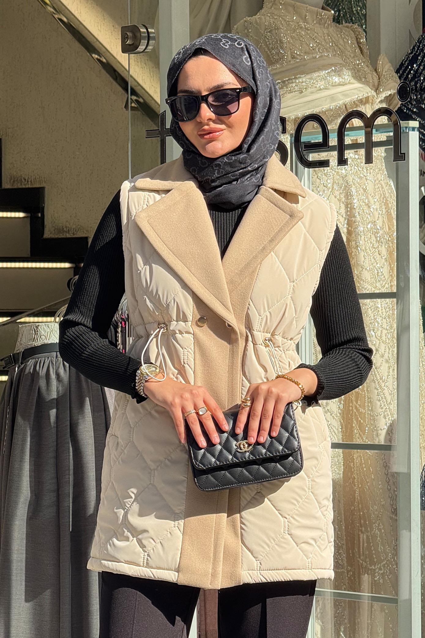Baklava Desen Premium Kaşe Detaylı Yelek Bej (ER2191)