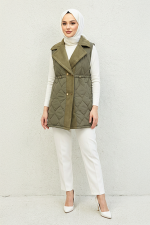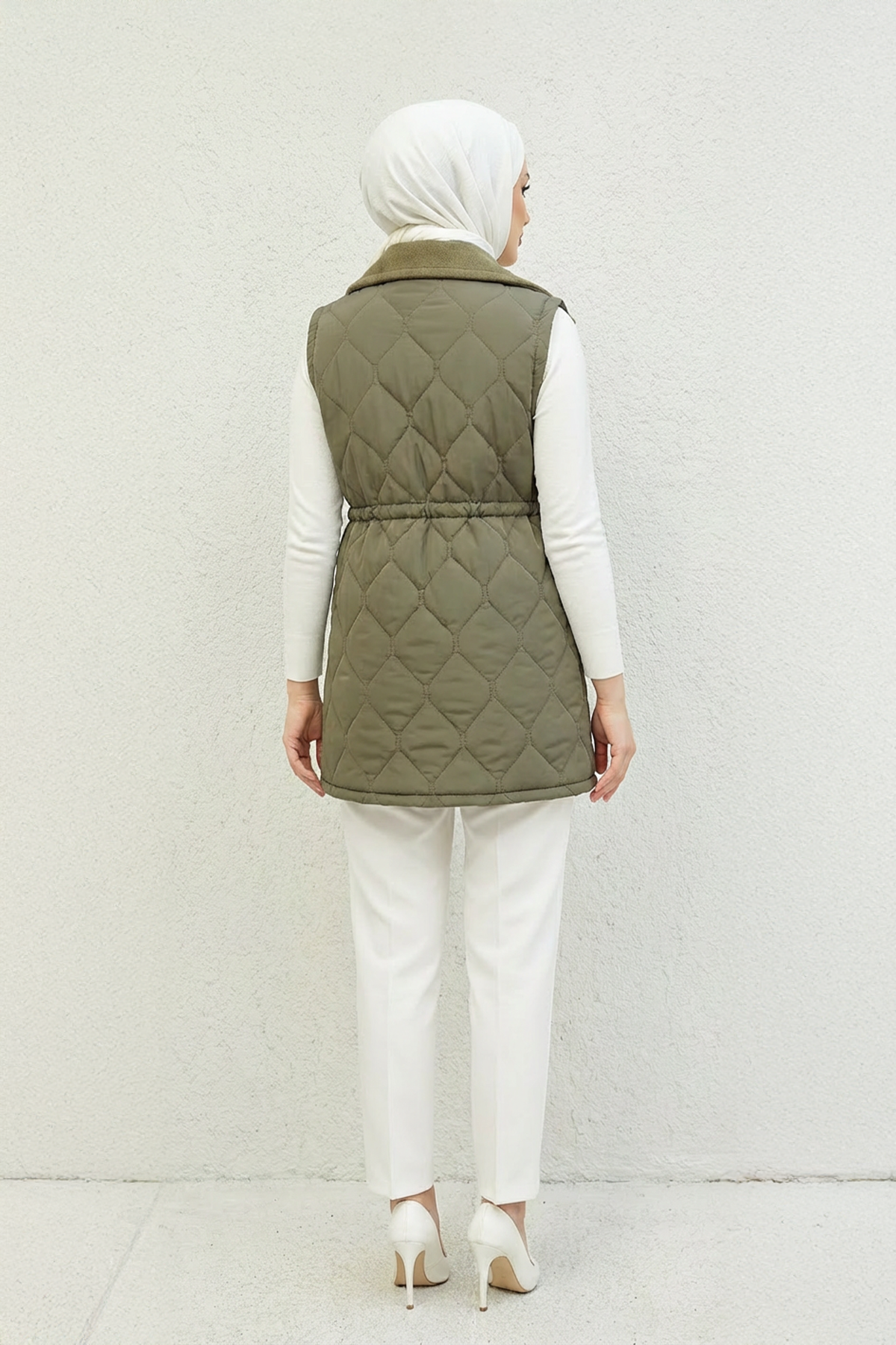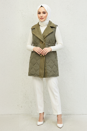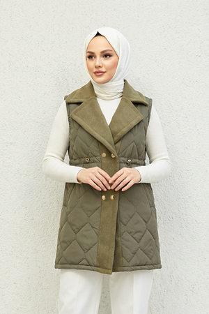 Baklava Desen Premium Kaşe Detaylı Yelek Haki