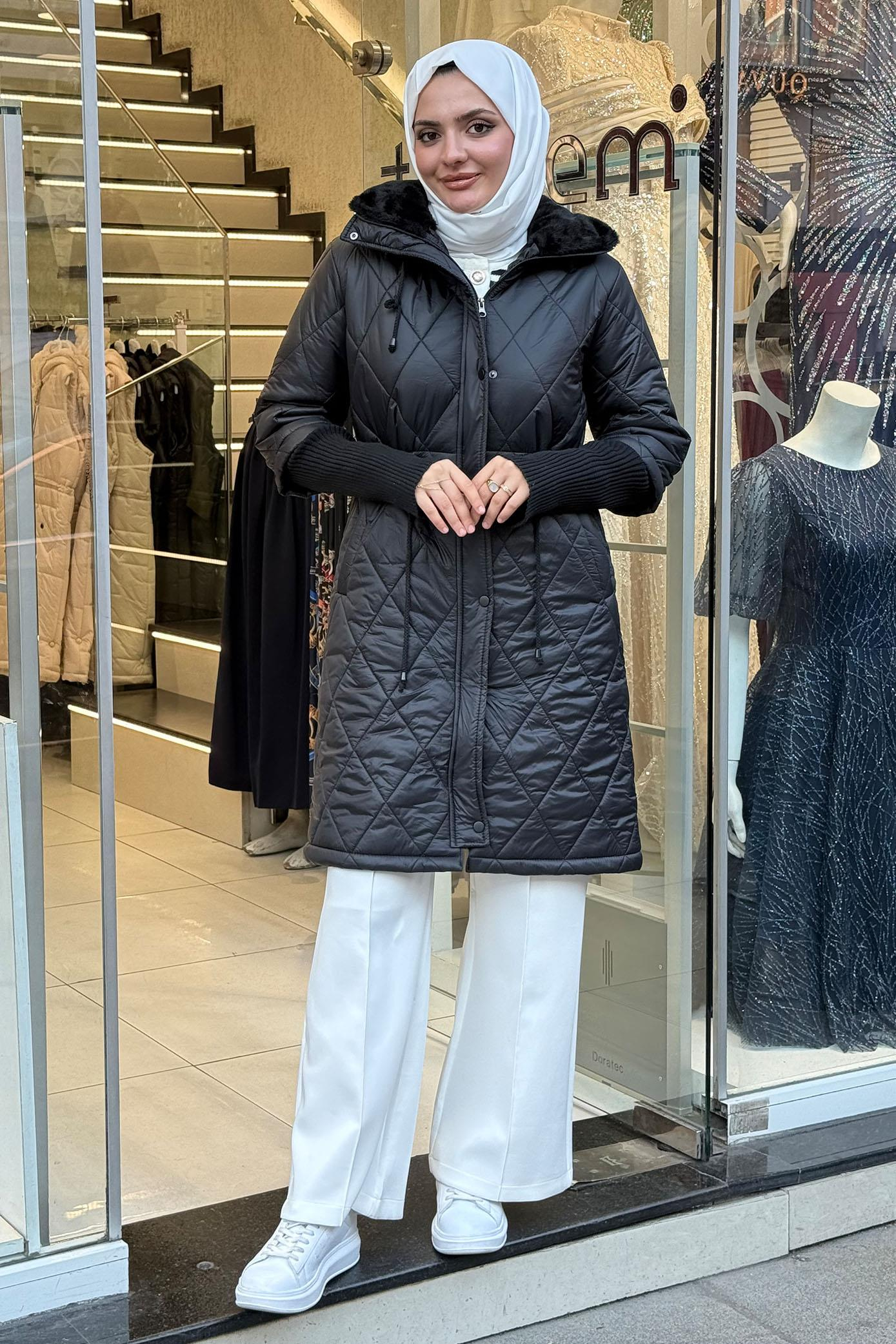 Kapüşonlu Kapitone Kumaş Mont Siyah