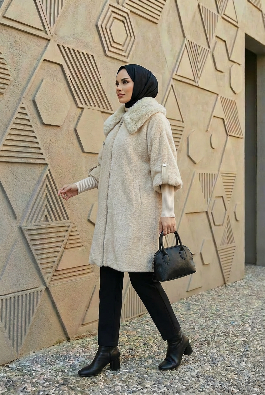 Kürk Detayı: Yaka kısmındaki yoğun kürk detayı, yüze aydınlık bir ifade verirken soğuktan korur.