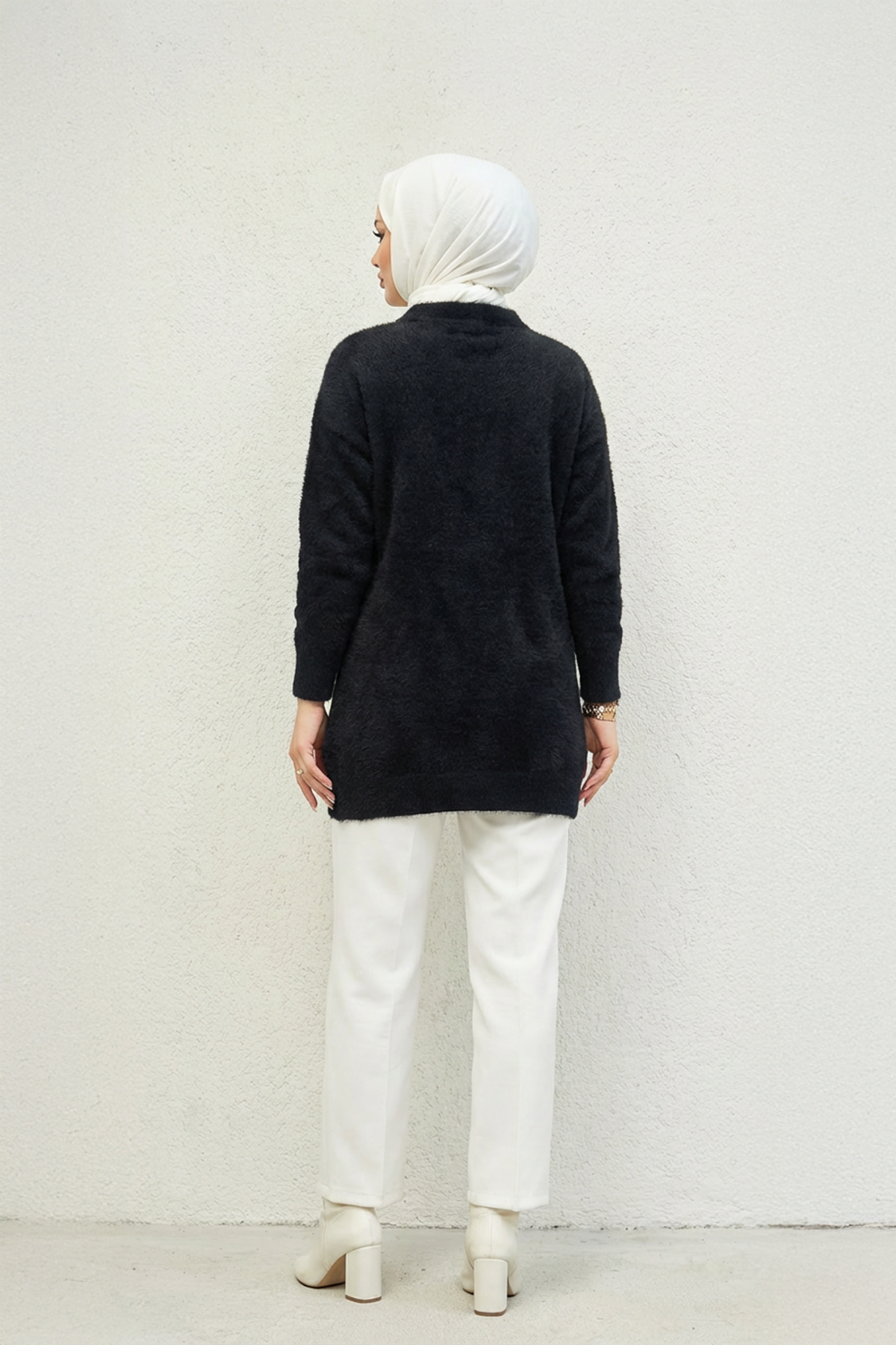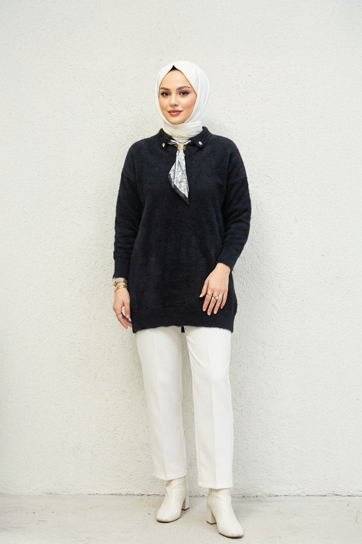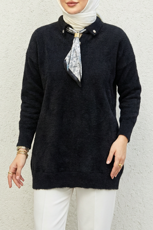 Yakası Fularlı Kazak Siyah
